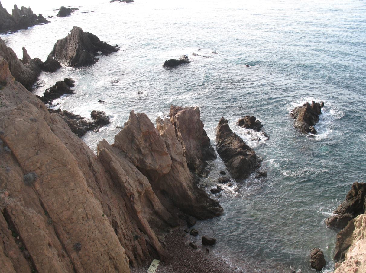 ‘The lighthouse that marks the Cabo de Gata cape, the point where the eastern and southern coastlines pinch together in a crooked black finger of rock, is one of Spain’s most desolate spots. Elsewhere along the coast the Mediterranean is usually a mill pond but around the cape the sea surges and foams against the base of steep, angular cliffs. Off-shore, the shadow of jagged reefs can be seen below the surface of the angry water – hence the lighthouse.’